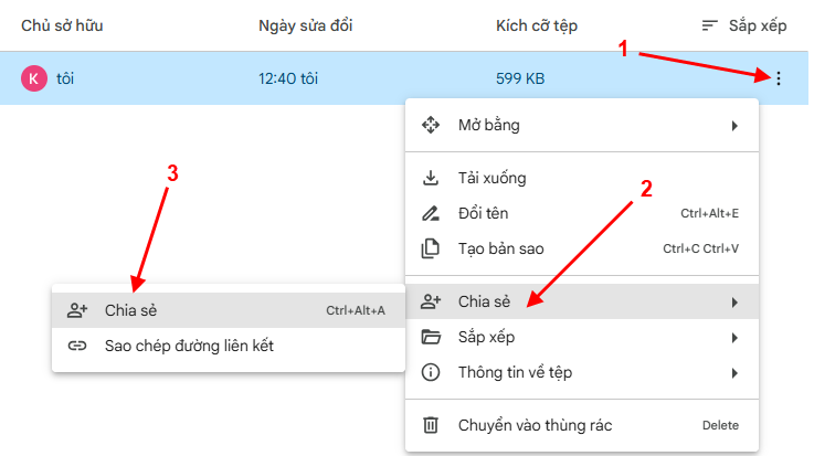 - Sau khi upload ảnh xong, tại hình bạn muốn chia sẻ, bấm vào dấu 3 chấm (1) chọn chia sẻ (2) và thiết lập chia sẻ (3) hình ảnh.