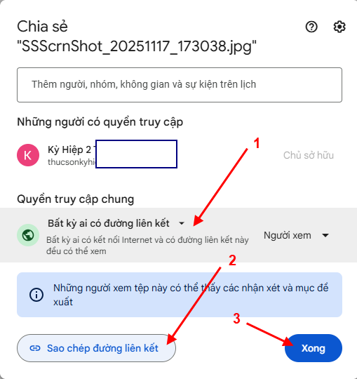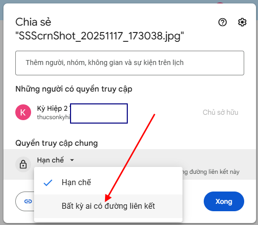 - Bấm chọn dòng "Bất kỳ ai có đường liên kết" << (bước này bắt buộc)