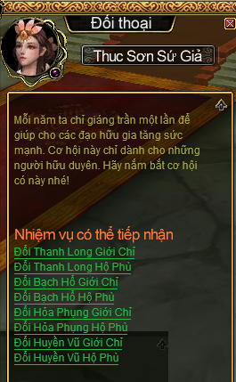Một năm mới lại đến, Thánh Điện tiếp tục mang đến cho quý đạo hữu nhiều cơ hội nâng cấp các Bộ Phù Chỉ cực vip lên đến đẳng cấp cao nhất thông qua NPC Thục Sơn Sứ Giả. Và NPC này chỉ xuất hiện duy nhất vào năm mới.