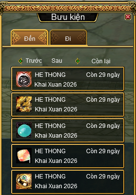 - Để tránh trường hợp bưu kiện quá đầy, vật phẩm không thể chuyển về cho nhân vật của mình. Quý đạo hữu vui lòng gỡ bớt các vật phẩm trong bưu kiện nhân vật của mình trước khi nhận phần quà từ sự kiện.