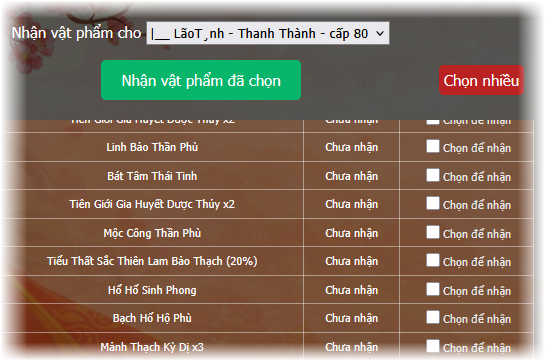 Sau khi nhận được các vật phẩm đã trúng thưởng, quý Đạo hữu vào mục “Lịch Sử” và chọn nhân vật và máy chủ cần nhận sau đó bấm “Nhận” để những vật phẩm đã trúng.