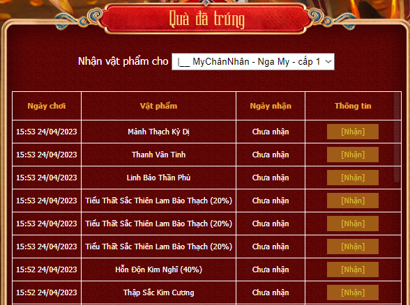 Sau khi nhận được các vật phẩm đã trúng thưởng, quý Đạo hữu vào mục “Lịch Sử” và chọn nhân vật cần nhận sau đó bấm “Nhận” để những vật phẩm đã trúng.