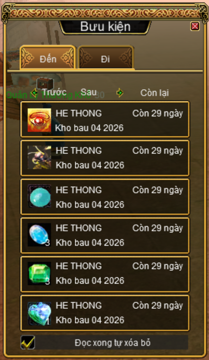 - Để tránh trường hợp bưu kiện quá đầy, vật phẩm không thể chuyển về cho nhân vật của mình. Quý đạo hữu vui lòng gỡ bớt các vật phẩm trong bưu kiện nhân vật của mình trước khi nhận phần quà từ sự kiện.