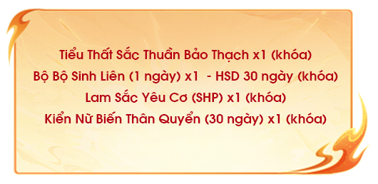 - Trong thời gian diễn ra sự kiện, đạo hữu nào chế tạo thành công vũ khí (cấp S) từ cấp độ 60 trở lên sẽ nhận được phần thưởng từ Thánh Điện.