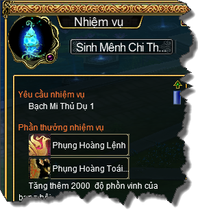 Sau khi hoàn thành nhiệm vụ đạo hữu sẽ nhận được phần thưởng là 1 Phụng Hoàng Lệnh và 1 Phụng Hoàng Toái Phiến.