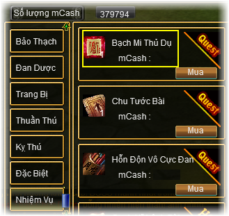 Để hoàn thành nhiệm vụ đạo hữu cần phải có vật phẩm Bạch Mi Thủ Dụ và vật phẩm này có bán tại Kỳ Trân Các (Nhiệm Vụ).