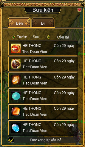 - Để tránh trường hợp bưu kiện quá đầy, vật phẩm không thể chuyển về cho nhân vật của mình. Quý đạo hữu vui lòng gỡ bớt các vật phẩm trong bưu kiện nhân vật của mình trước khi nhận phần quà từ sự kiện.