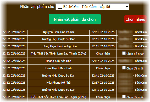 Sau khi nhận được các vật phẩm đã trúng thưởng, quý Đạo hữu vào mục “Lịch Sử” và chọn nhân vật và máy chủ cần nhận sau đó bấm “Nhận” để những vật phẩm đã trúng.