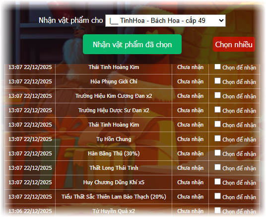 Sau khi nhận được các vật phẩm đã trúng thưởng, quý Đạo hữu vào mục “Lịch Sử” và chọn nhân vật và máy chủ cần nhận sau đó bấm “Nhận” để những vật phẩm đã trúng.