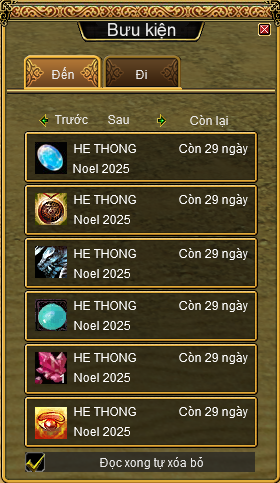 - Để tránh trường hợp bưu kiện quá đầy, vật phẩm không thể chuyển về cho nhân vật của mình. Quý đạo hữu vui lòng gỡ bớt các vật phẩm trong bưu kiện nhân vật của mình trước khi nhận phần quà từ sự kiện.