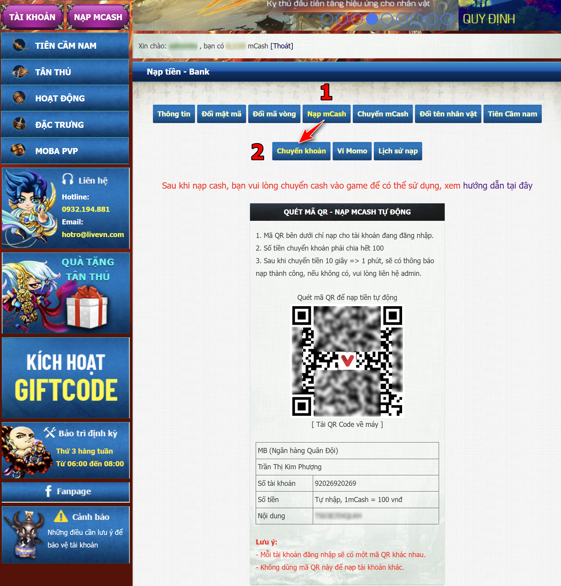 Bước 2: Chọn nạp mCash => Chuyển khoản: